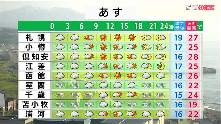 札幌や倶知安、函館は晴れて、夏日が続きます。水分や休憩をこまめにとりましょう。室蘭や千歳、苫小牧は低い雲や霧がかかります。
