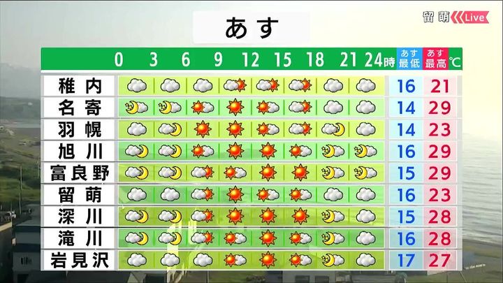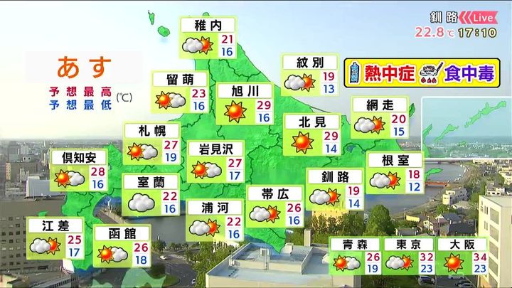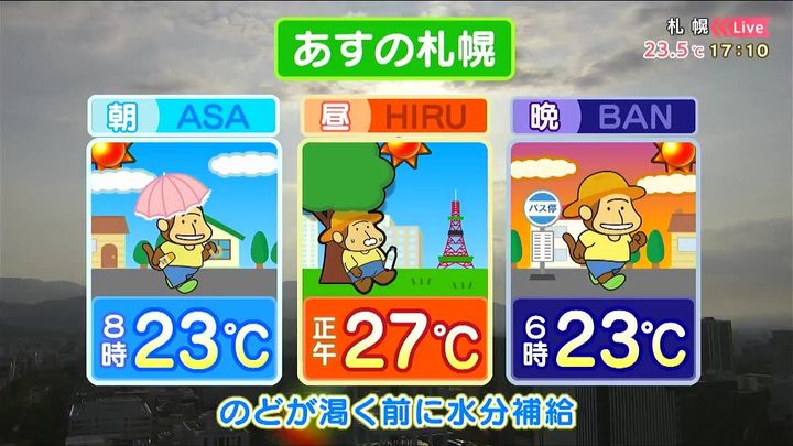 あすも強い日差しが照り付け、札幌では4日連続で25度以上の暑さが続きます。のどが渇く前にこまめに水を飲んで、熱中症にならないように気を付けて下さい。