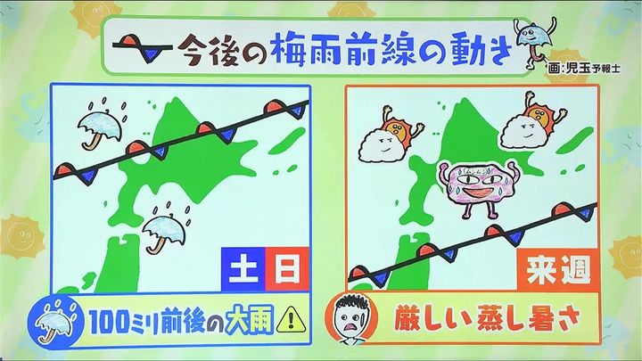 土日は北海道にかかるんですね。そして前線の活動が活発になり、日本海側や道南方面の多いところで100ミリ前後の大雨になるおそれがあります。来週は前線が東北地方に南下します。晴れ間が出ますが、前線付近のムシムシした空気が入り、厳しい蒸し暑さになりそうです。来週もまだまだ熱中症対策が必要ですね。