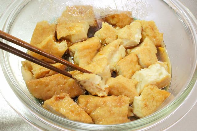 5. 厚揚げをひっく返し、ラップを密着させてさらに5分漬けます。