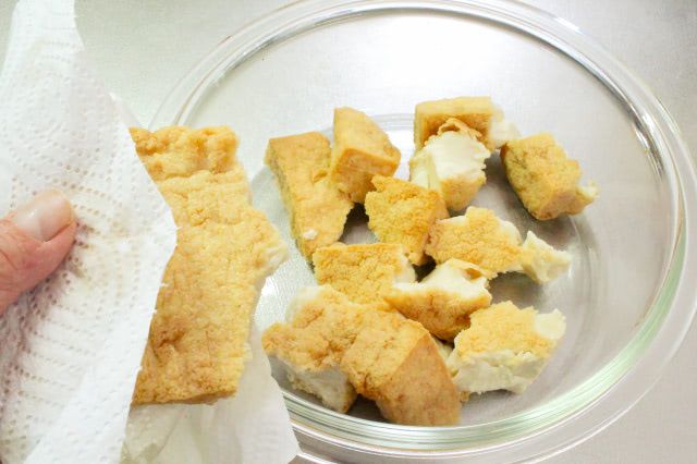 1. キッチンペーパーで、厚揚げの油を軽く拭き取ります。厚揚げを手でちぎって耐熱容器に入れ、ゴマ油を和えます。