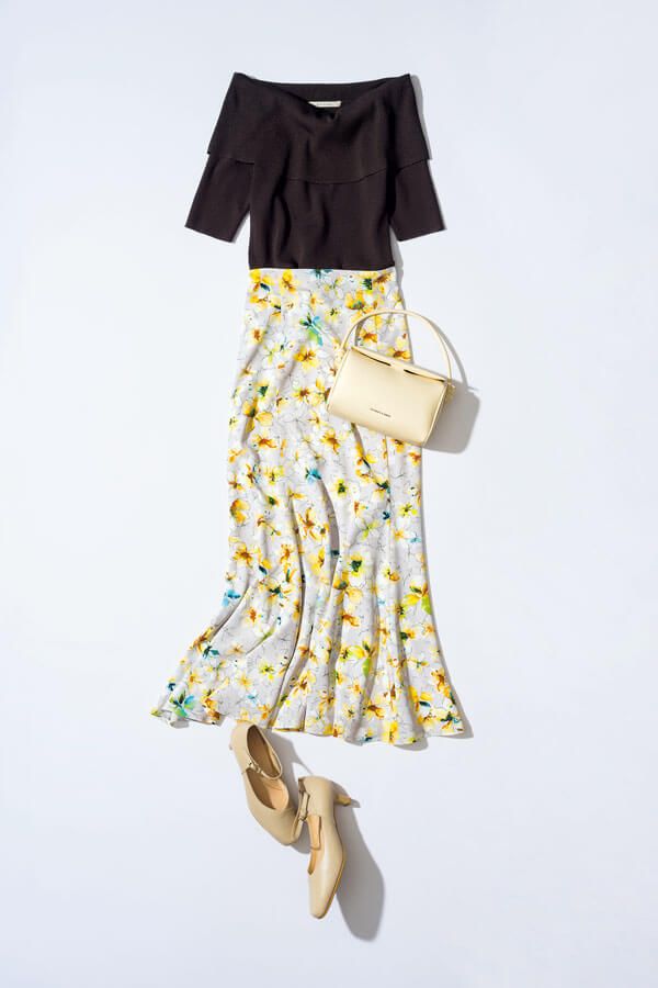 鮮やかなフラワープリントが目を引く、初夏にぴったりのマーメイドスカート。黒やパステルを選びがちなオフショルニットをブラウンに替えて、新鮮な印象に。