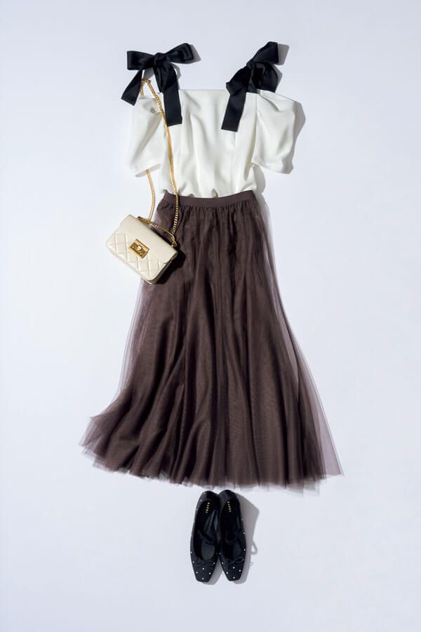 ふんわりと透けるチョコレートのような茶色が主役。肩リボントップス×チュールスカートのフェミニンアイテムを組み合わせても、色みを落ち着かせれば可愛くなりすぎる心配はありません。