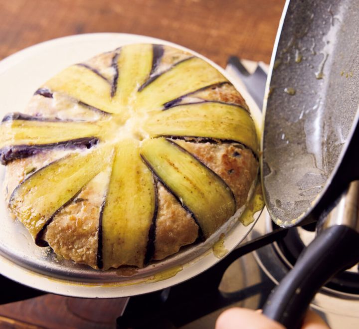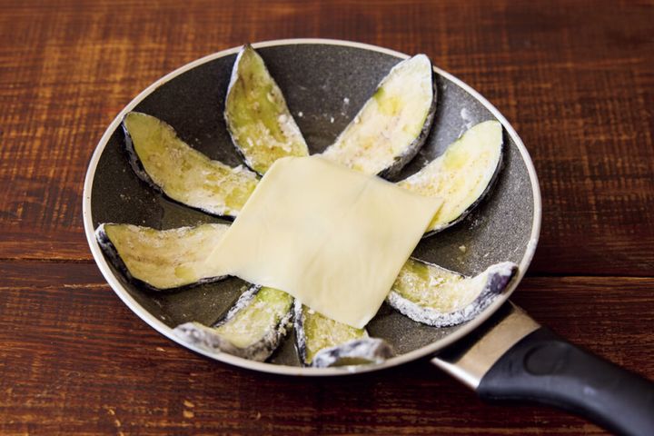 直径約20cmのフライパンにオリーブオイル大さじ1を薄く塗り、なすを放射状に並べて中央にチーズ1枚を置く。肉だねの1/2量を全体に広げ、残りのスライスチーズをちぎってまんべんなくのせる。残りの肉だねを広げ、形を整える。