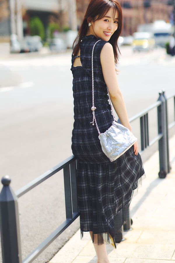 チュールを重ねたチェック柄ワンピでなら、レディで上品な華感も十分。