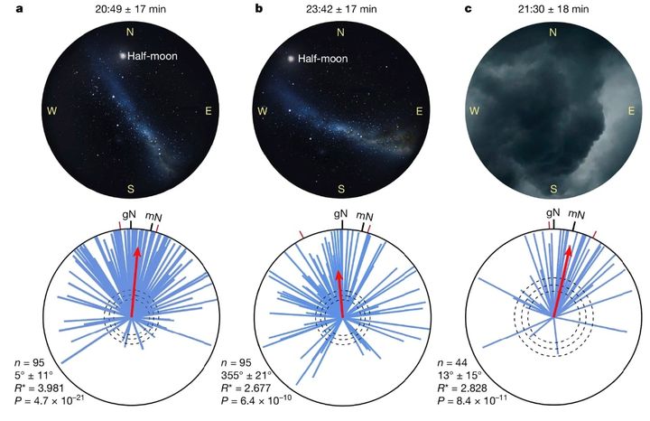 星空の位置とそれに対応する蛾の進行方向、一番右は曇っている場合/ Credit: David Dreyer et al., Nature(2025)