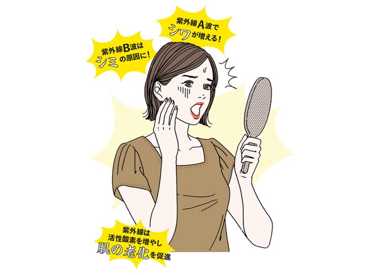 「紫外線A波(UVA)は肌の奥まで届いてコラーゲンを分解し、シワの原因に。紫外線B波(UVB)は肌の表面が赤く炎症を起こし、シミの原因になります。さらに、炎症を起こす過程で活性酸素をつくり出し、肌の酸化=肌をサビつかせることで細胞の機能を低下させ、肌の老化を助長するのです」