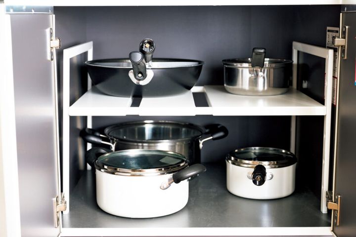 鍋やフライパンを選ぶときは、軽量で使いやすく、お手入れしやすいことを優先して。取り出しやすいよう、キッチン収納に合った分だけに数を絞りましょう。
