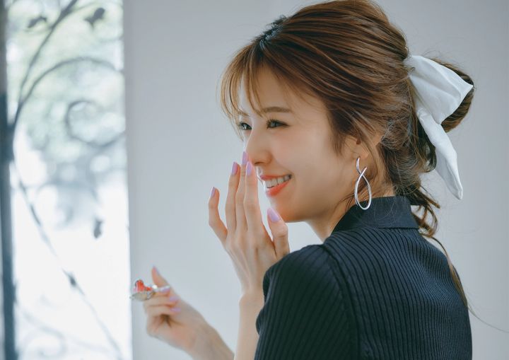 黒アンサンブル(襟付きニット)¥18,700、ハーフパンツ¥20,900/ともにアルページュストーリー シュシュ¥7,590/コードエー(ワールド) シルバーピアス¥14,300/サローネ サーティ(フォーティーン ショールーム)