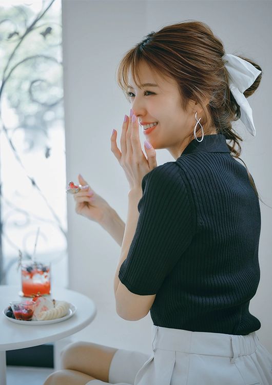 襟付きニットの前をしめてポロニット風に。ほどよいハンサム感をゲットできます。トレンドのハーフパンツも、短すぎない絶妙な丈感で子どもっぽさを軽減。トレンドのビッグシュシュで顔まわりをキャッチーに盛り上げて♡
