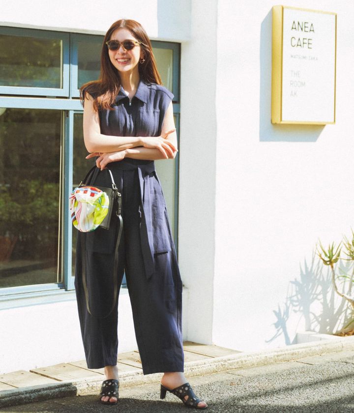 パンツ部分のコクーンシルエットが今っぽさを作り出すオールインワン。リネン混の素材は涼しげで真夏でも心地よく着られます。キレイめにもカジュアルにも振れるネイビーがタスク多めな40代にはイチオシ!