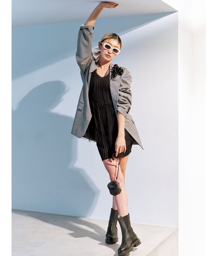 ジャケット¥110,000(チノ/モールド)レーストップス¥39,600ブローチ各¥32,000(すべてDES PRÉS/DES PRÉS)ニットミニワンピース¥27,500(アカネ ウツノミヤ)バッグ¥20,900(MayuCo.)ブーツ¥161,700(セルジオ ロッシ/セルジオ ロッシ カスタマーサービス)サングラス¥53,900(DMY ストゥディオス/ザ・ウォール ショールーム)