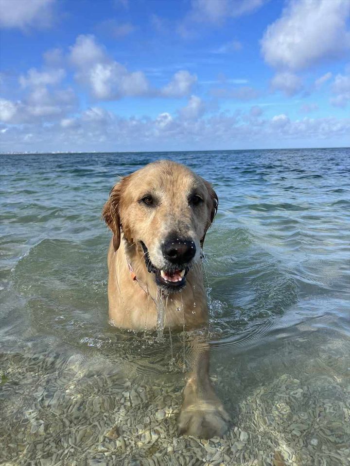 こちらは、ゴールデンレトリバーの『ハリー』くん。 海に浸かってご機嫌になっていました! 楽し気ですがすがしい写真ですね~。