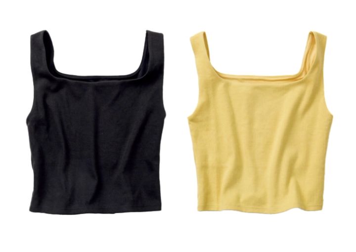 直線的なラインがデコルテを美しく見せる。タンクトップ[接触冷感、吸水速乾、抗菌防臭、吸湿放湿]各¥990/GU