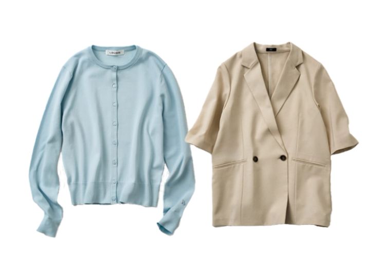 左・カーディガン[UVカット手洗い可、ドライタッチ]¥14,300/ルーニィ、右・ジャケット[接触冷感、UVカット、吸水速乾、[洗濯機可]¥19,000/PLST
