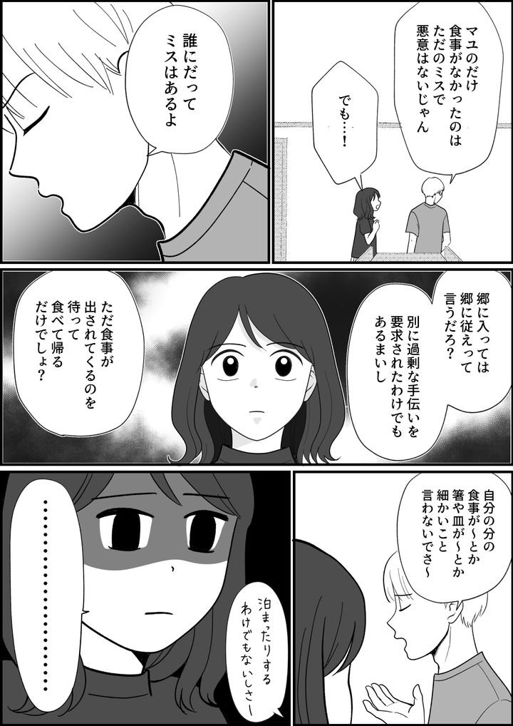 私(マユ)は、夫のコウタと結婚して2年目です。共働きのため、家事の分担はしっかりとしています! 夫は穏やかで優しい人。しかしそれは、事なかれ主義と言い換えることもできるのかもしれません。夫の弟ヨウスケさんは、奥さんのチエさんと2才になる娘のユウナちゃんとの3人家族。義実家からは年に3回、ヨウスケさん家族とともに食事会に招かれます。まぁ同居をしているわけではないし、食事会くらいなら……と、参加をしていました。しかし2回目の食事会から、私の分の食事が用意されなくなってしまったのです。夫に話すと、次に同じことがあったらしっかり伝えると言ってくれました。その言葉を信じて義実家の食事会に行ったのに、夫はまるで伝書鳩のような役割しかしなかったのです。