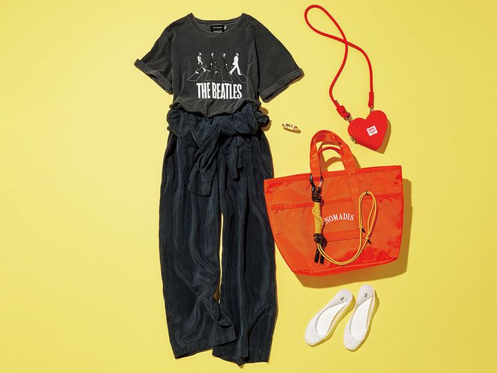Tシャツ※別注¥6,270(グッドロックスピード/ドレステリア 渋谷スクランブルスクエア店)トートバッグ¥19,800ストラップ¥11,000(ともにノマディス/ノーベルバ)ショルダーバッグ¥11,000(アウトドア プロダクツ×ファーストハンド/ファーストハンド オフィシャル オンライン ストア デイトナパーク)シューズ¥5,980(ザラ/ザラ カスタマーサービス)バングル¥19,800(ワンエーアールバイウノアエレ/ウノアエレ ジャパン)