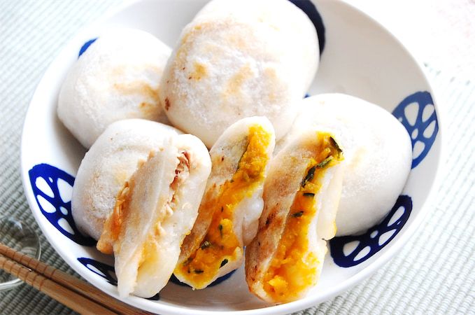 具は、お好みのものということなので、「チーズ&ツナ」、みそに長ねぎのみじん切りと砂糖、白いりゴマを混ぜた「ねぎみそ」、茹でたかぼちゃに砂糖を混ぜた「かぼちゃ餡」、梅干しと塩昆布を混ぜた「梅&昆布」を用意しました。
