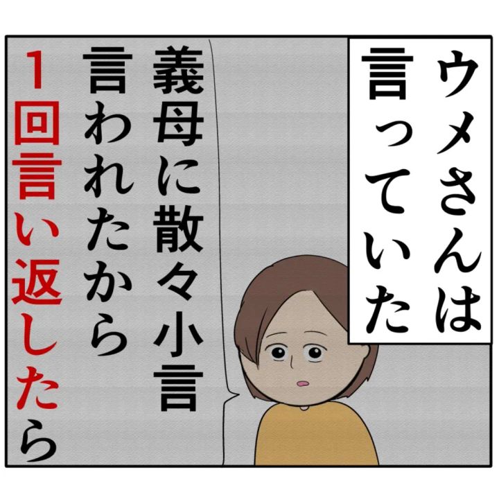 初めて義母に反論したさくらさんは、以前ウメさんが言っていたことを思い出しました。義母に嫌われているウメさんはこう言っていました。「義母に散々小言を言われたから1回言い返したら、」