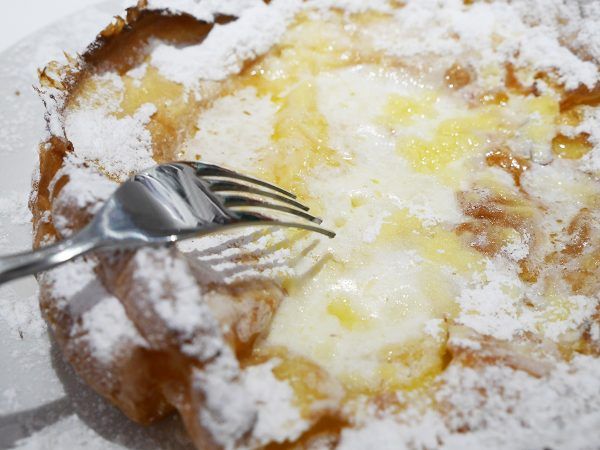 ジャーマン生地と呼ばれる、サクサク、ふわふわ食感のパンケーキです。