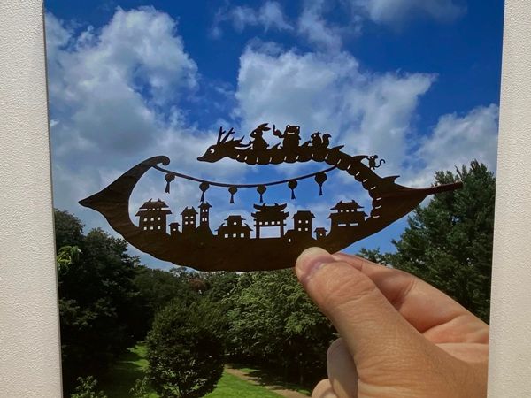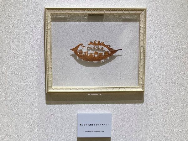 会場のドアには、葉っぱ切り絵の作品の一つをモチーフにした装飾が施されており、来場者を出迎えてくれます。 ちなみにこちらの作品は「葉っぱの小旅行inチャイナタウン」という横浜中華街をイメージして作られた作品です。