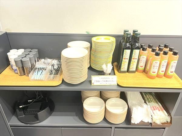 シチリア産海塩やブラックペッパー、オリーブオイル、ホットソースなどを自由に使用できます。