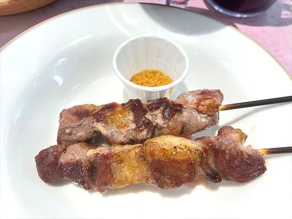 次は『アロスティチーニ』(400円)のご紹介。塩味があるラム肉をやみつきスパイスにつけていただきます。