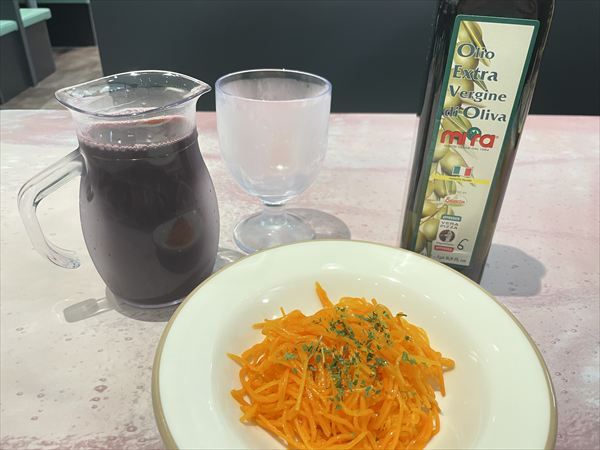 「サイゼリヤ」はサラダメニューが充実しています。デカンタワイン(500ml 400円)と一緒にいただいたり、オリーブオイルをかけたりと楽しみ方はそれぞれ。筆者は『キャロットラペ』をあるものと一緒にいただきます。それは…