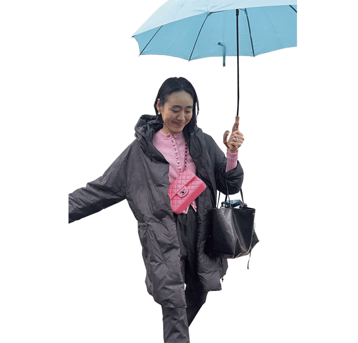 バッグもなんやかんや黒という金子さんが選んだ意外性たっぷりのピンクのシャネルバッグ。「チェーンやマークが全部黒だから、黒ベースな服に絶妙にマッチするんですよ」。なるほど、ちゃんと自分のスタイルに合うポイントが計算されている!
