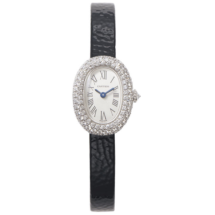 「修理をお願いしにカルティエへ行ったら、出会ってしまったのがこの時計。悩んで3回見に行きました(笑)。おばあちゃんになってしていても可愛いなと思って遂に手元へ」深いネイビーのベルトにダイヤモンドという組み合わせも綾さんらしい。
