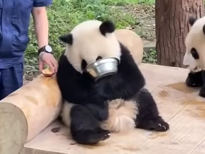 器をかぶって隠れた気になっている! 子パンダさんの可愛すぎる行動