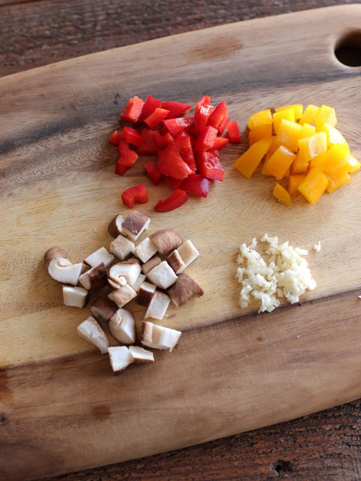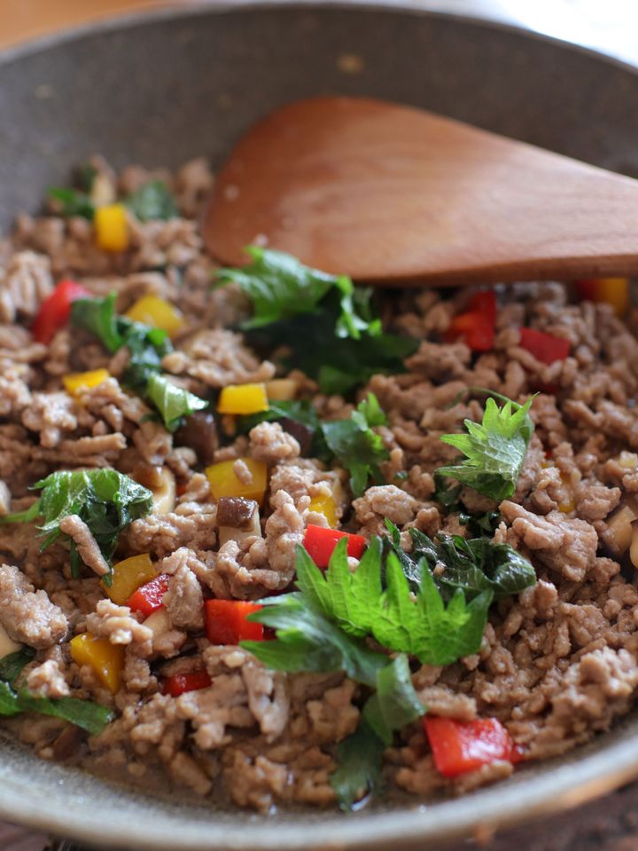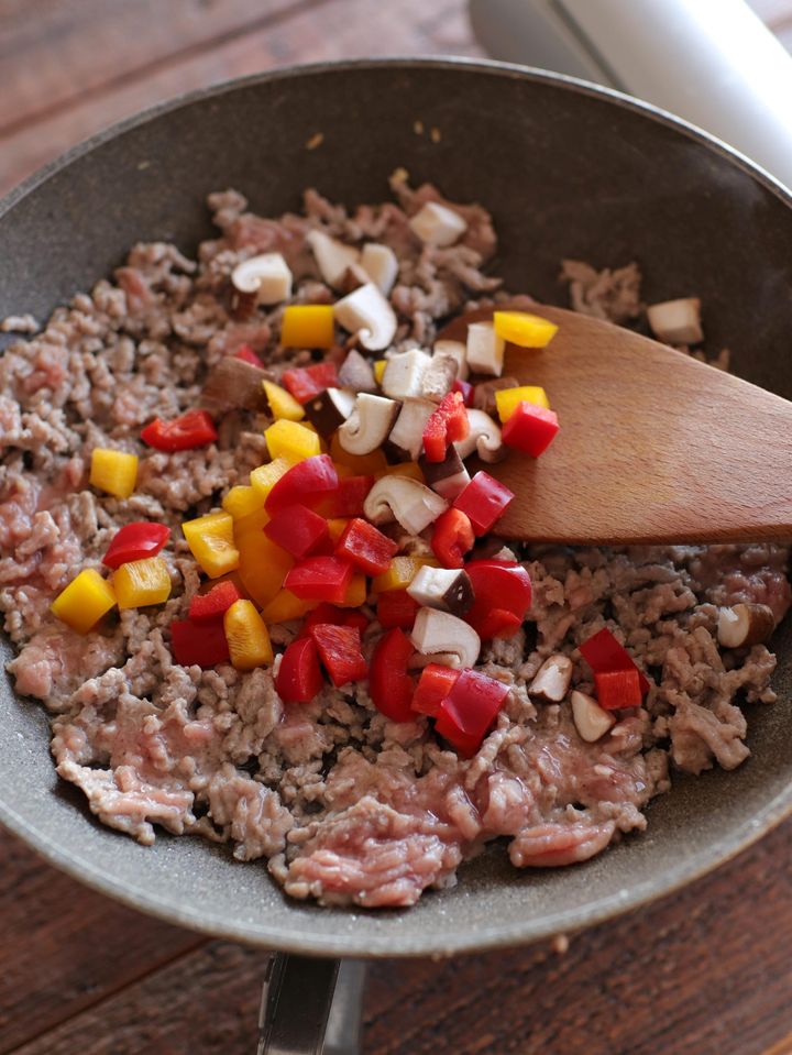 ②フライパンに油を熱し、弱火でじっくりにんにくを炒める。香りが立ってきたら、ひき肉を入れてほぐしながら炒める。しいたけ、パプリカを加えて炒め合わせる。しんなりしてきたらAを加える。