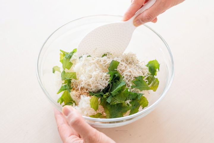 ①ボウルにすべての材料を入れ、全体をさっくり混ぜる(大葉の解凍不要)。