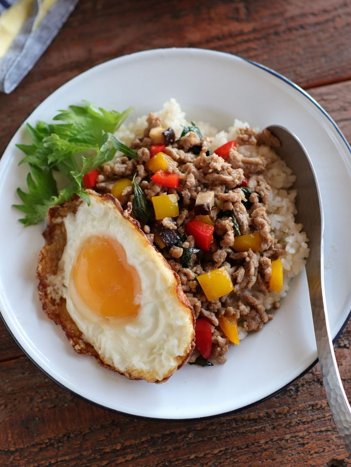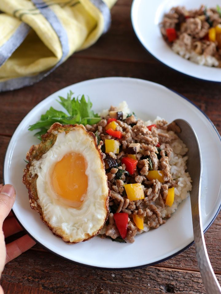 ④皿にご飯を盛り、③、目玉焼きをのせる。