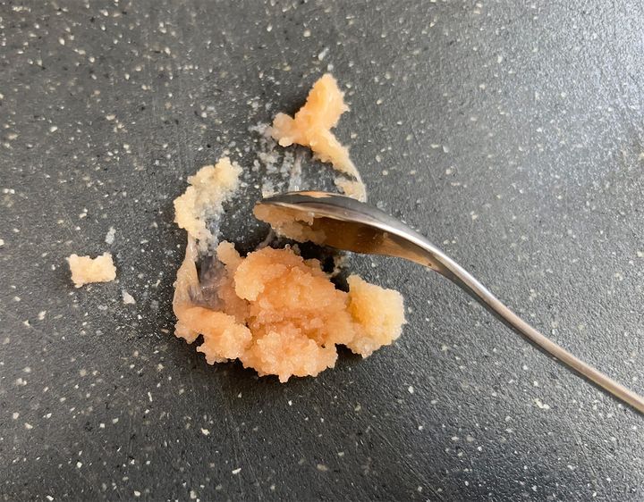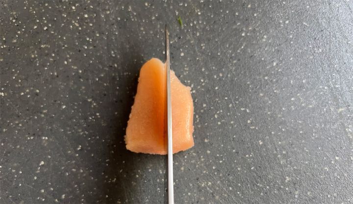 4. 切り込みを開いたら、スプーンまたは包丁の背を使って、魚卵をやさしくしごき出します。
