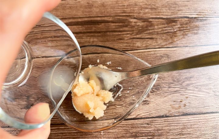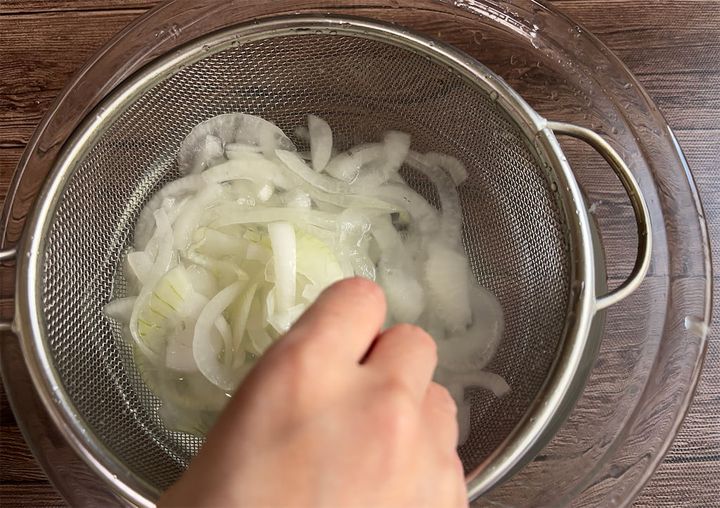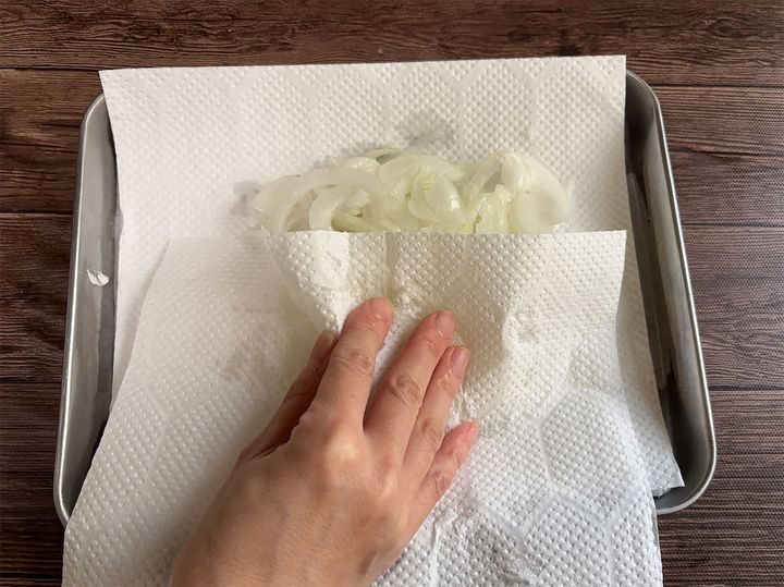 2. 出てきた水分をキッチンペーパーで軽く押さえたあと、流水でもみ洗いをし、さらにペーパーなどでしっかり水気を取ります。このひと手間で辛味が抜けて、より食べやすくなります。
