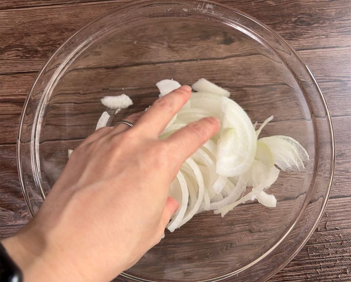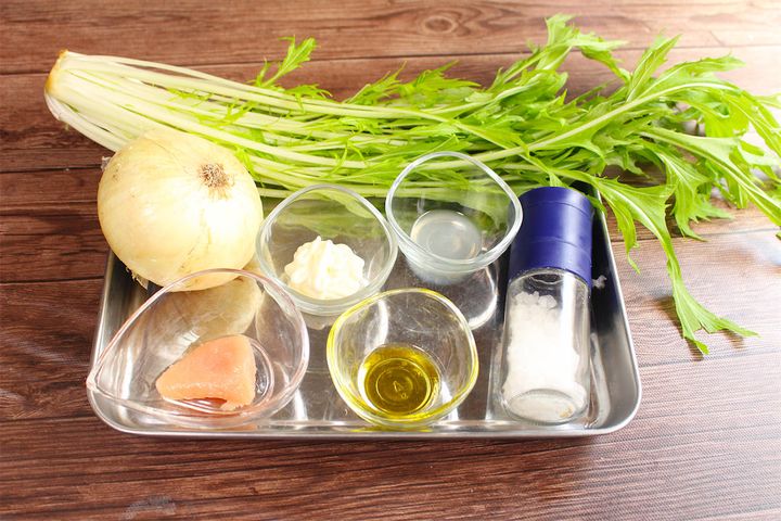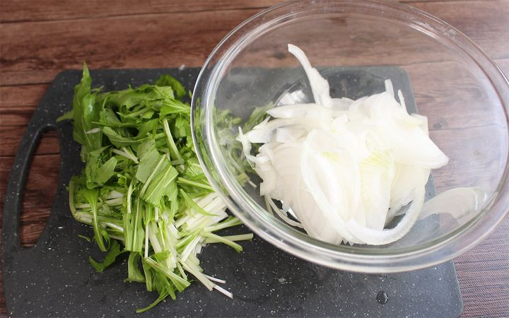 1. 新玉ねぎは、繊維に逆らうように薄くスライスします。繊維に逆らって切ることで、辛味成分が流出しやすくなります。スライスした新玉ねぎ全体に軽く塩をふり、5〜10分ほど置いて水分を出します。水菜は3~4cmに長さに切っておきます。