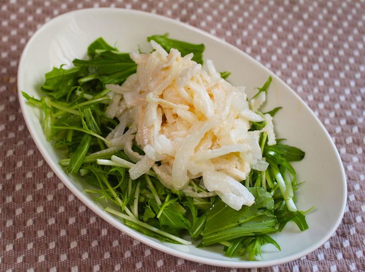 7. 器に食べやすく切った水菜を敷き、その上に6をふんわりと盛ったら完成!水菜の鮮やかな緑がアクセントになり、食欲をそそる見た目です。
