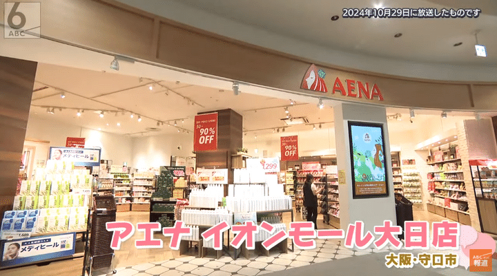 やって来たのは大阪・守口市にある「アエナ」イオンモール大日店。コスメや食料品などを取り扱う店だが、有名ブランドの化粧水がなんと41%オフ、海外ハイブランドの香水はなんと衝撃の70%オフなど、最大90%オフの驚異の値引率は目を疑うほど!