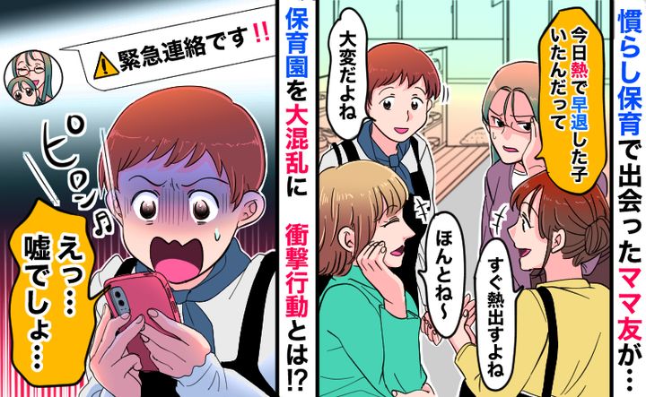 なんとそのママは、その日の夜、慣らし保育に通っているママたちのグループチャットに「緊急連絡です! 今日、熱で早退した子は、流行り病の可能性があるのに通園していました! みなさん、明日は子どもを休ませましょう」と、連絡してきたのです。