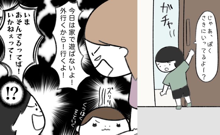 かいくんが外へ行こうと誘っても、「中であそぶ!」と言うこうたくん。かいくんが外に出て、かかじりさんが外へ行こうと促しても、こうたくんは頑なにかかじりさん宅から出ようとしません。