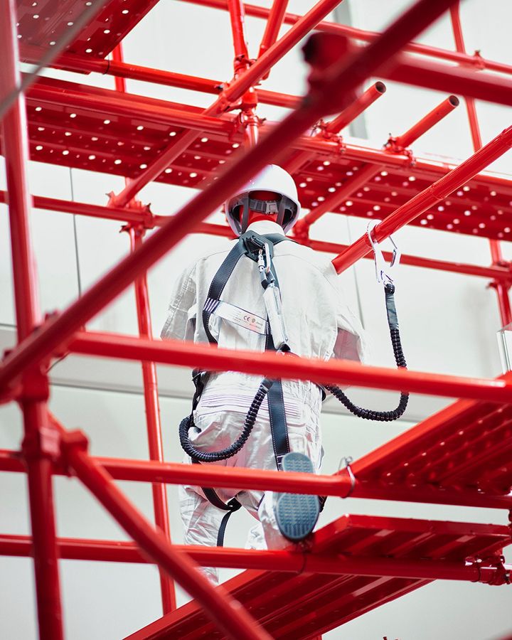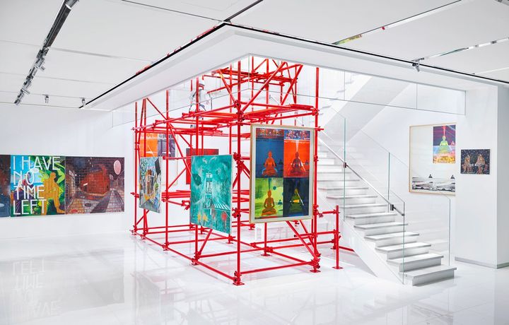 本展は美術評論家・南雄介によるキュレーションのもと、「未完」をテーマに約30点の作品で構成される。その中核となるのが、自画像や家族を主題に新たに制作された6点の作品群だ。また、1970年の大阪万博にて横尾氏が提示した赤い足場のインスタレーションも、グッチ銀座 ギャラリーの吹き抜けと屋上で再構成され、来場者に強い印象を与えている。