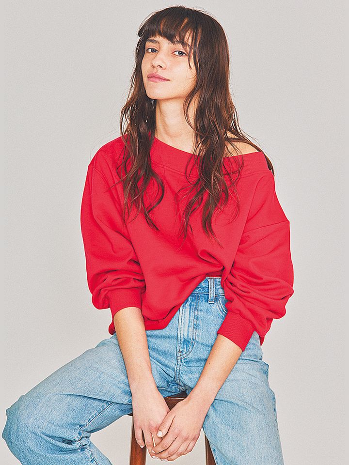 赤オフショルスウェット/BAYFLOW(アダストリア) ライトブルーデニムパンツ/UNIQLO and JW ANDERSON(UNIQLO) 隙のあるオーバーサイズからのぞくデコルテが、センシュアルな女性像へ。目にとまるヴィヴィッドな赤でもヘルシーさを保てるのは、ラフなスウェット生地だからこそ。
