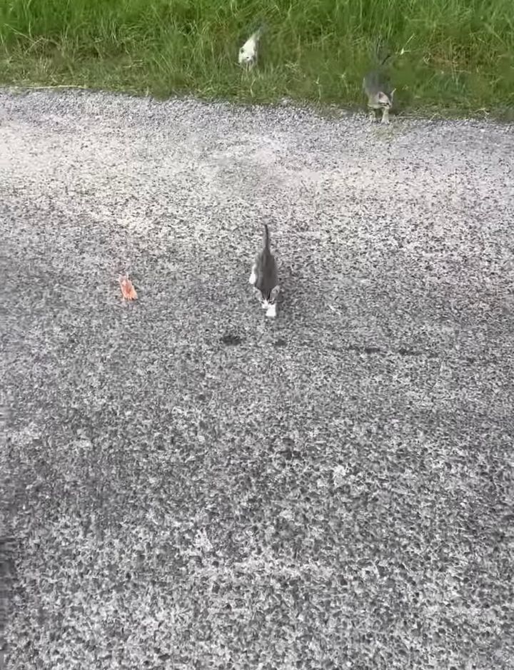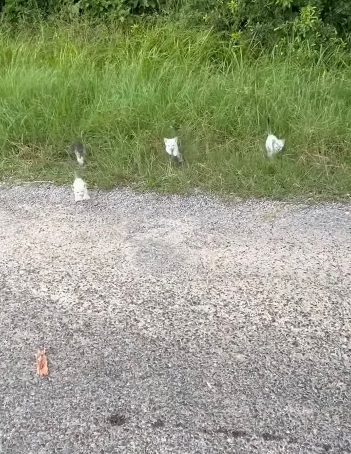 最初の子が抱き上げられると、『今だ!』とばかりに絶妙なタイミングで登場した他の子猫たち。 揃って草むらに隠れていたところを見ると、最初の子が男性の気を引く役目を引き受けていたのでしょうか。