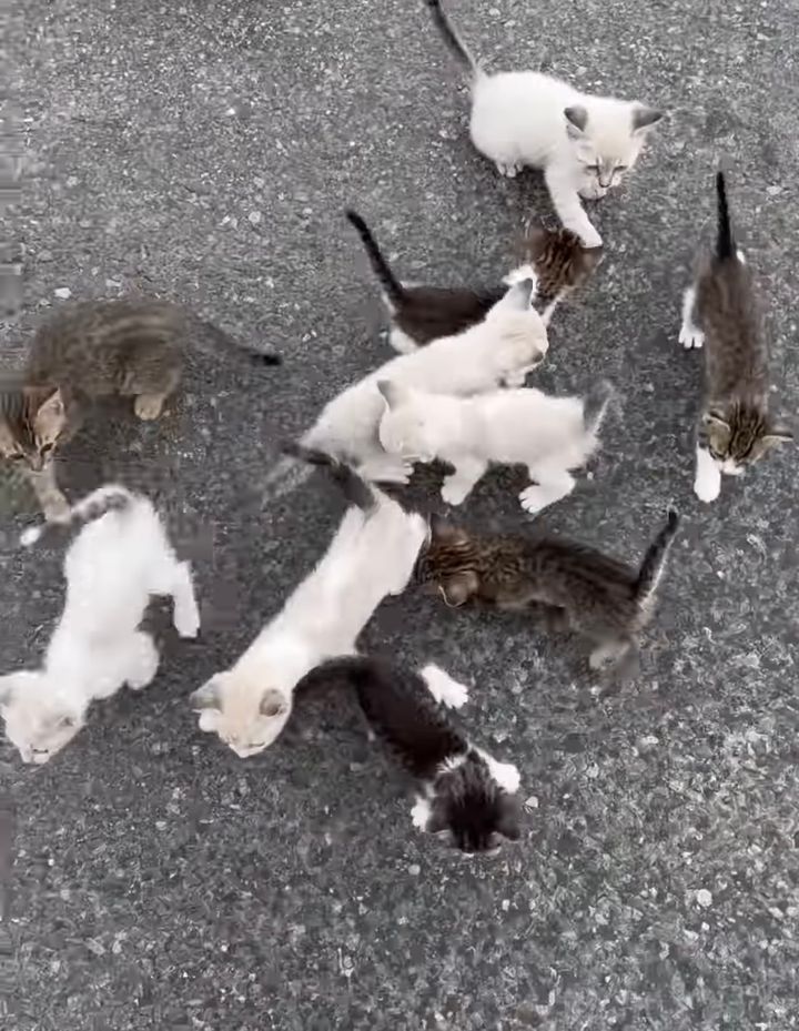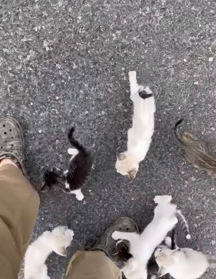 なんと、草むらから子猫がゾロゾロ出てくると、男性に向かって来たのです。
