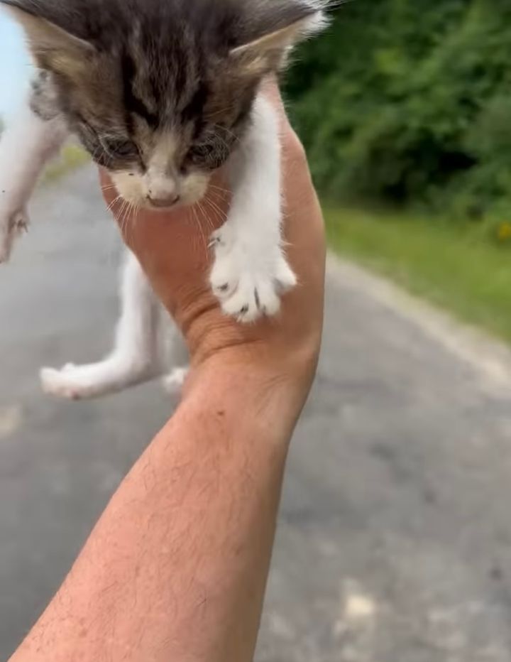 一直線に向かってきた子猫を、男性はひょいと抱き上げます。 こんな子が道端で彷徨っていたら、放っておくわけにはいきませんよね。