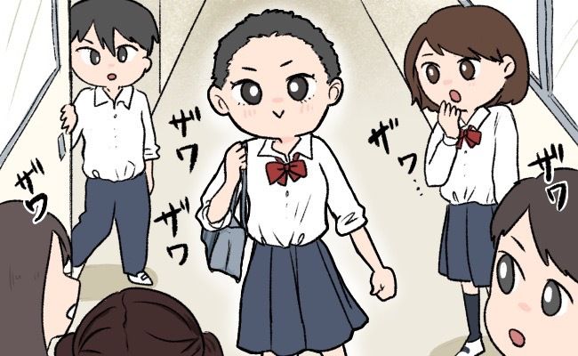 そして、高校3年生のとき、県大会に出場するか引退するかの大切な大会を前に、髪を切ることに。美容室で「思いっきり切ってください!」と強く志願した結果、髪の長さは1cm……人生初のほぼ坊主に! その後、私の「ほぼ坊主」は部活の仲間を越えて、クラスメイトにまで衝撃を与えました。