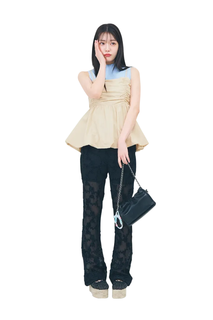 ギャザー入りのキャミやタイトなフレアーパンツででスタイルアップ効果を期待♡ 肌見せや透け感で女っぽさをオン。