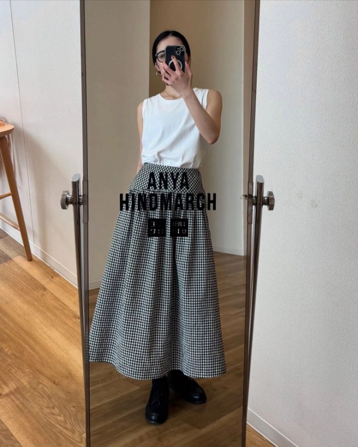 甘くなりがちなギンガムチェックのスカートをカジュアルにシフト