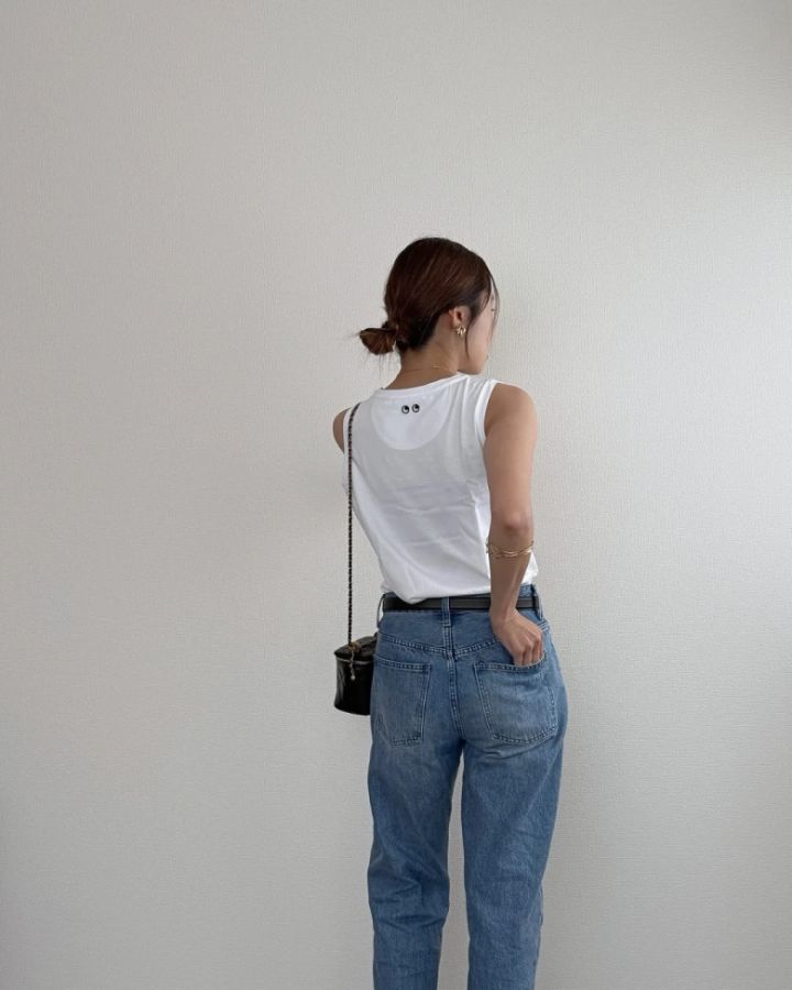 こちらもデニムと組み合わせたコーディネートですが、トップスを白のノースリーブTにすることで、よりヘルシーな印象に。@iamami62さんは、髪をアップスタイルにして、爽やかな夏らしい印象を演出しています。コーデの主役ともいえるバックにあしらわれた目玉も、しっかりアピール♡ちょい辛口なバッグやアクセサリーなどでメリハリをつけるのもコツです。カジュアルもちょっと大人顔に仕上がります。